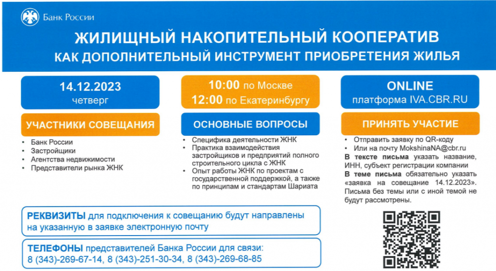 Уральское главное управление Центрального банка Российской Федерации (далее - Уральское ГУ Банка России) сообщает о проведении совещания на тему «Жилищные накопительные кооперативы как дополнительный инструмент приобретения жилья» (далее - Совещание).
